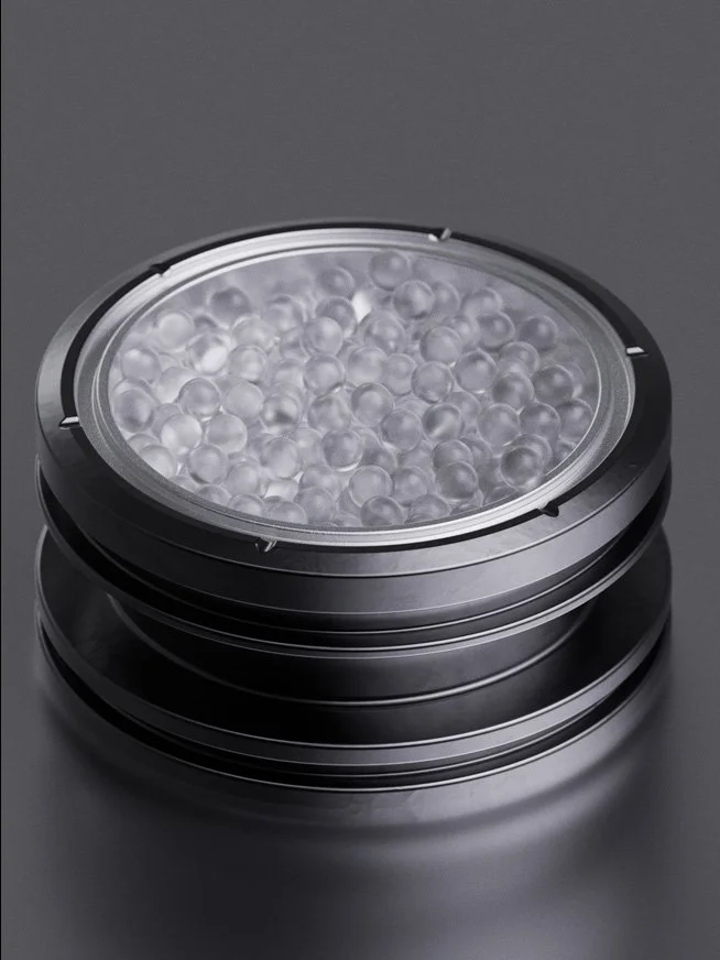 A large sea of plastic balls surround a powerfully stationed metal molding object.